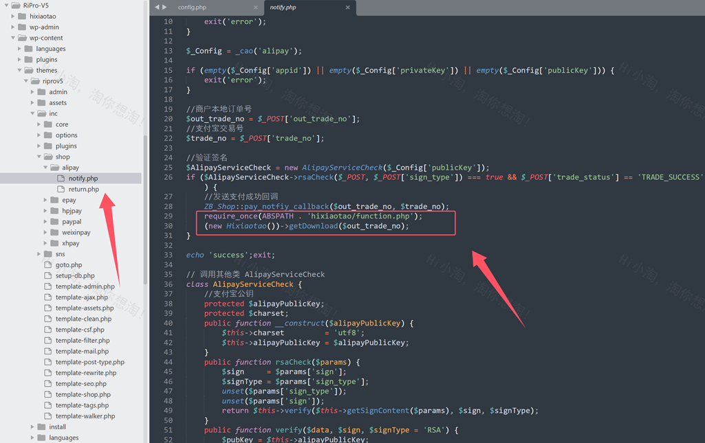三、 将以下代码2行代码粘贴在RiPro-V5的支付回调中。如:主题目录/inc/shop/alipay/notify.php