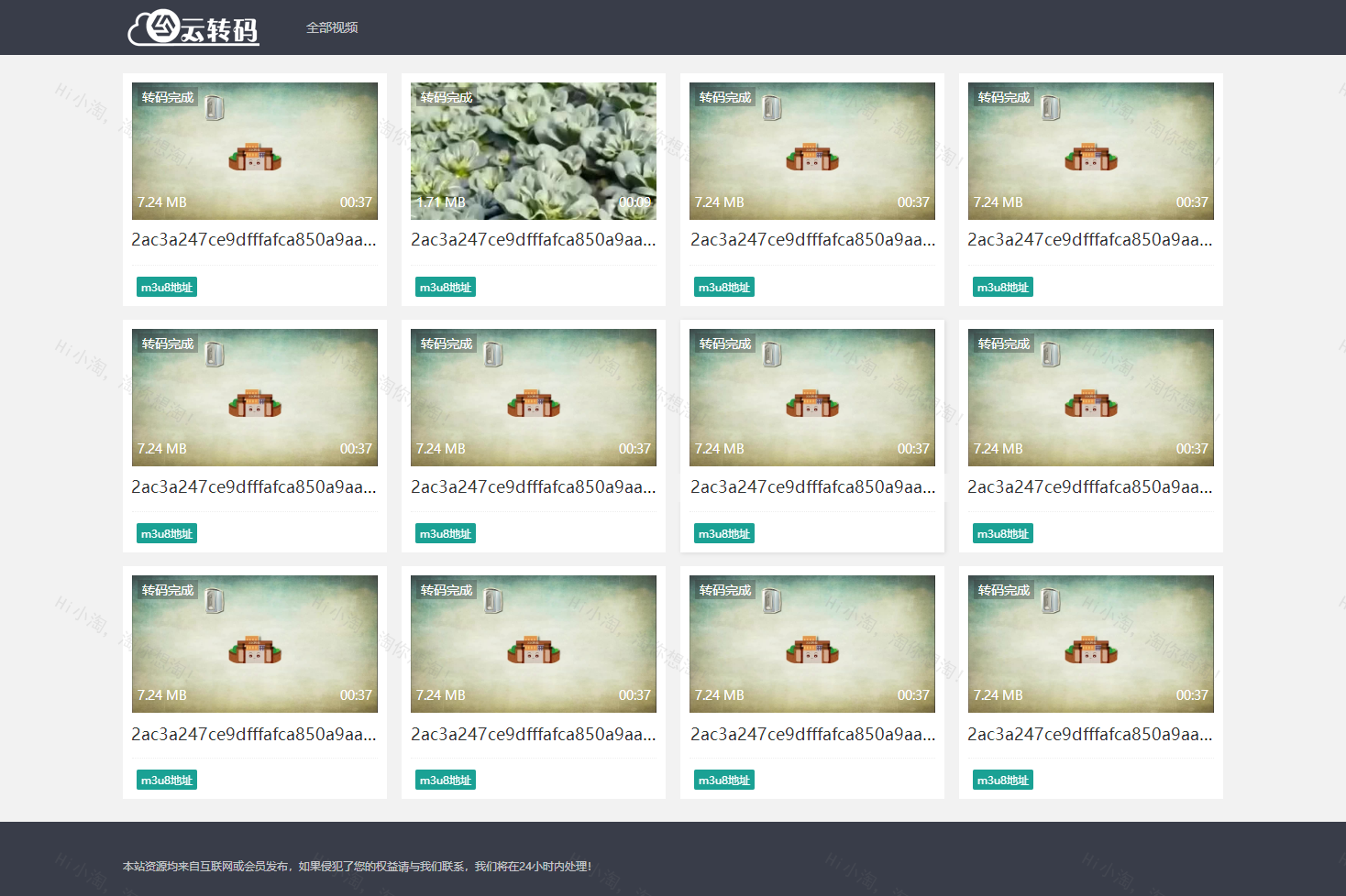 现在,解决办法来了。这套程序部署后,在自己的网站上传的视频将会被自动切成ts格式使用m3u8播放器播放。完全不用担心视频太大,解决了不是mp4 h.264制式在浏览器不能在线播放的问题。