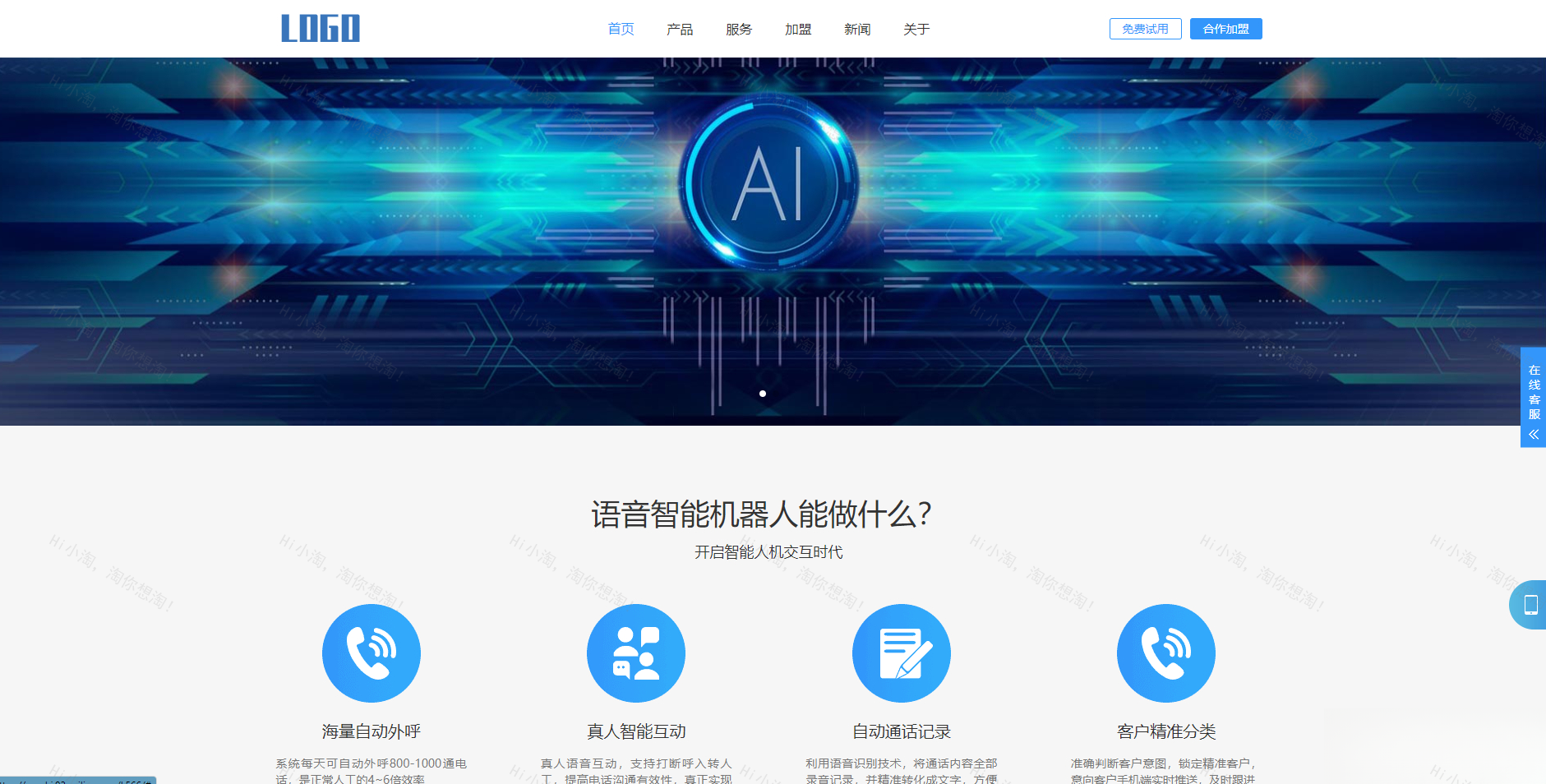 PbootCMS内核开发的网站模板,该模板适用于智能电话网站、AI语音软件网站等企业,当然其他行业也可以做,只需要把文字图片换成其他行业的即可;
