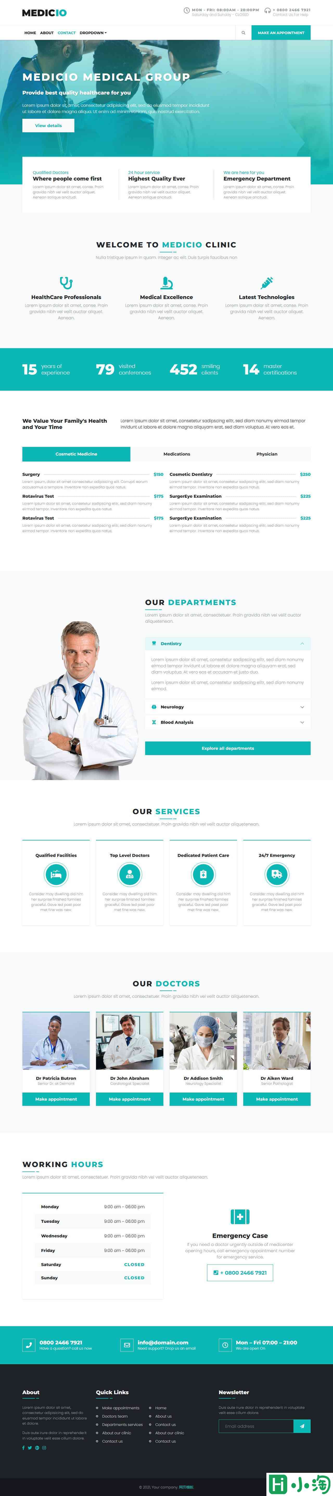 该模板有许多在医疗行业常见的组件及功能,例如预约表单、服务项目、团队展示以及部门介绍、价目表等。