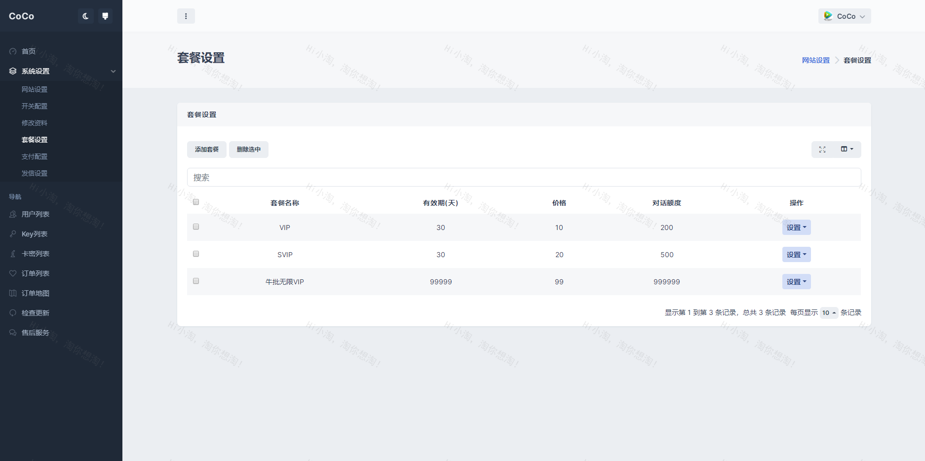 支持设置付费套餐,支持官方支付以及易支付,支持API接口更改,支持卡密
