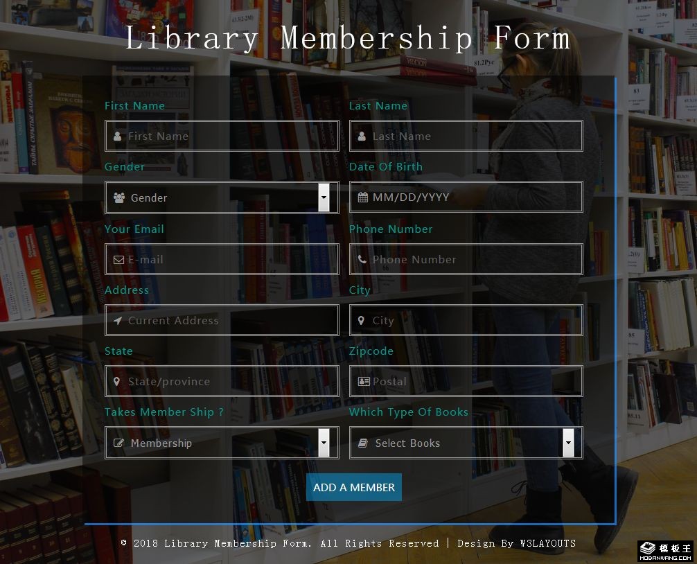 图书馆会员登记表单响应式网页模板。