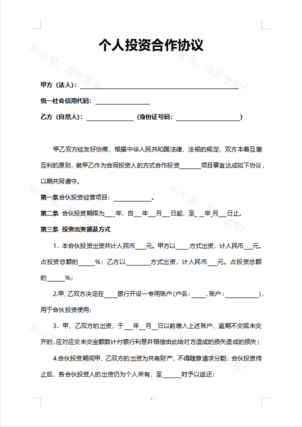 个人投资合作协议合同word模板