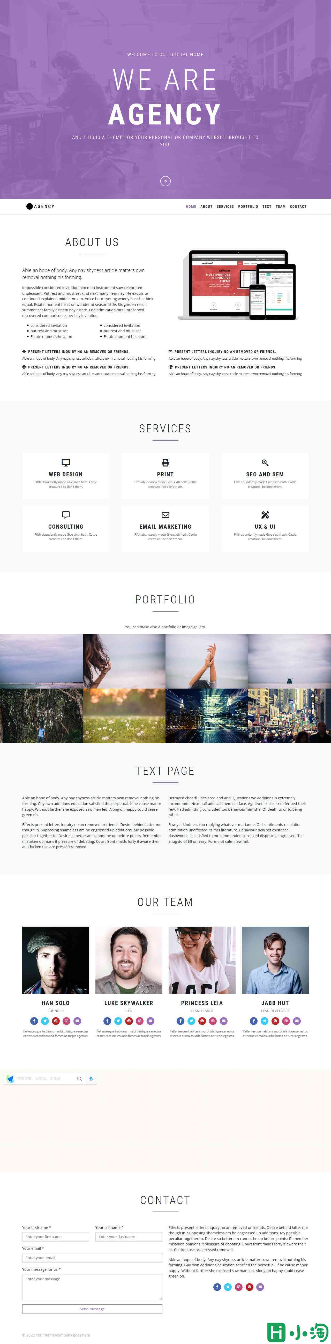 这是一个单页面模板,适合一些初创企业的机构进行推广而设立的页面,该页面由全屏背景英雄区、关于我们、服务项目、灯箱特效作品集图片展示、团队展示、文字介绍、地图、联系表单等区块组成。