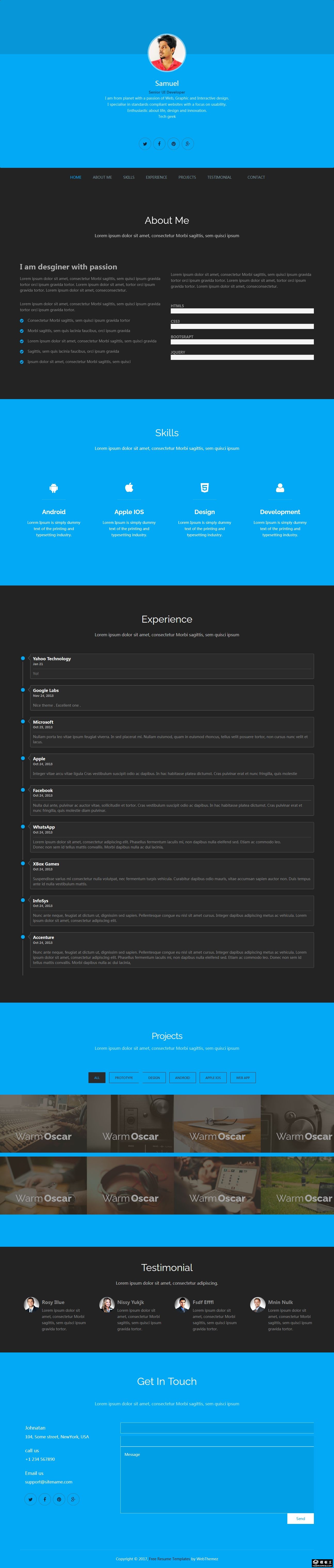蓝色个人简历展示响应式网页模板。