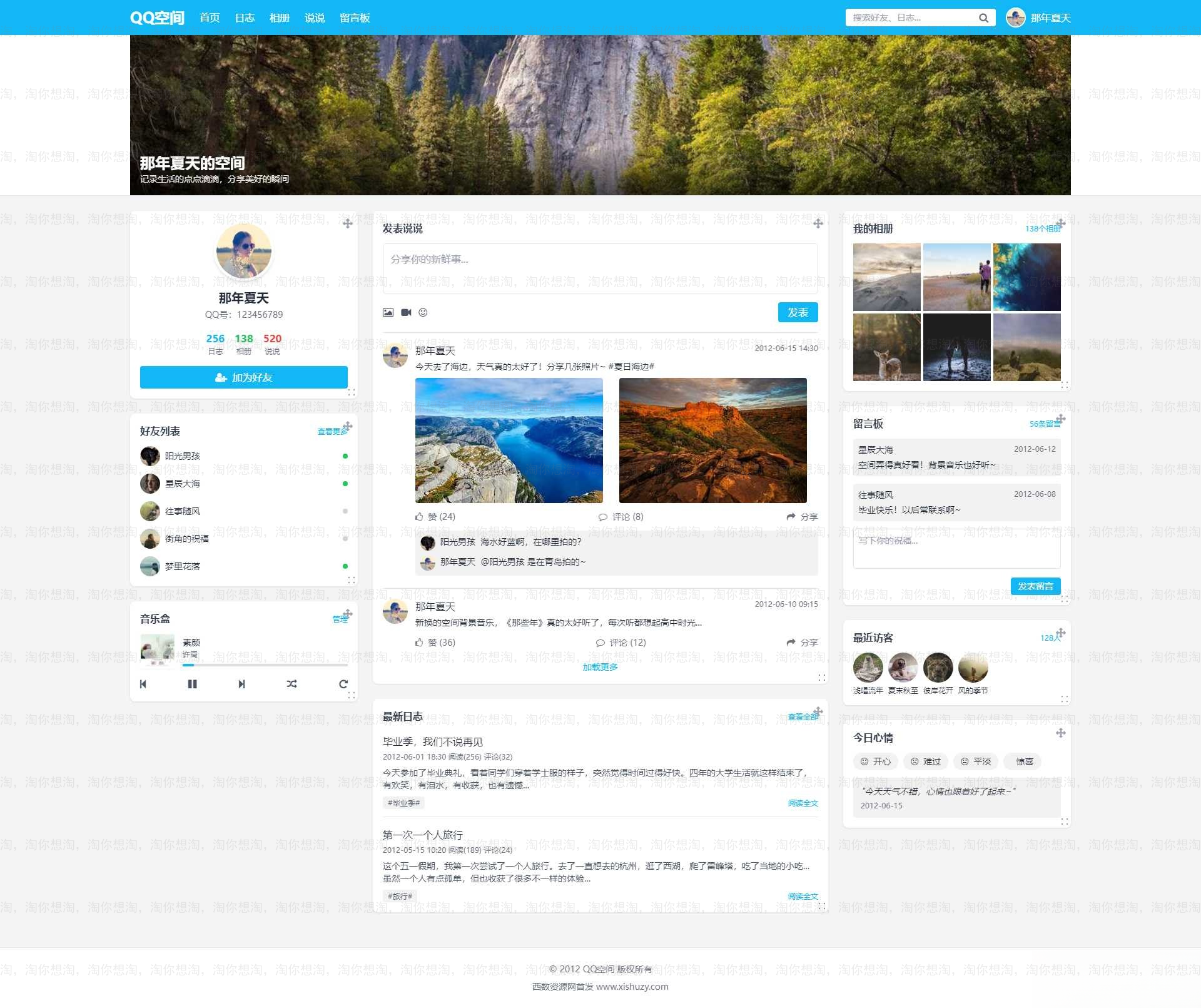 时代感内容:页面中的说说、日志、相册等内容都围绕 2012 年左右的流行元素和表达方式,如 “那年夏天”、”毕业季” 等主题,唤起用户的回忆。