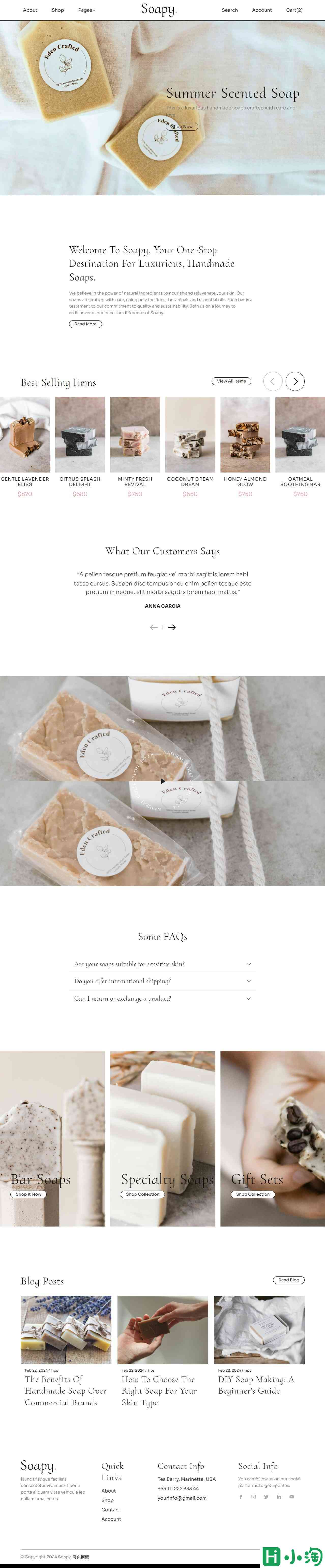 【手工香皂网店商城模板】是专为手工香皂在线销售精心设计的电商网站模板。其简约时尚、大气优雅的设计风格,不仅适用于手工香皂的展示与销售,还因其通用性广泛,同样适用于饰品店、珠宝店、服装店等追求时尚与品质的购物商城。这款模板能够为您的在线业务增添一份独特的魅力,助力您吸引更多顾客的关注与喜爱。