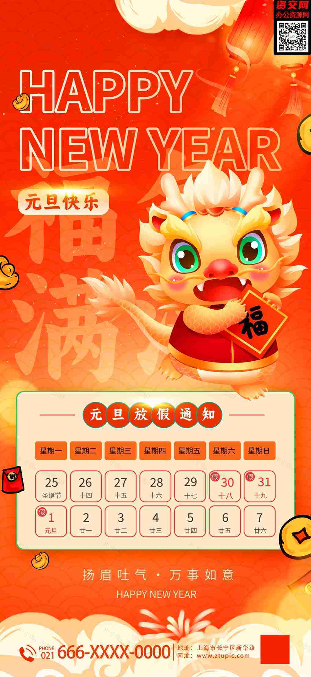2024龙年春节元旦福气满满放假通知海报模板免费下载