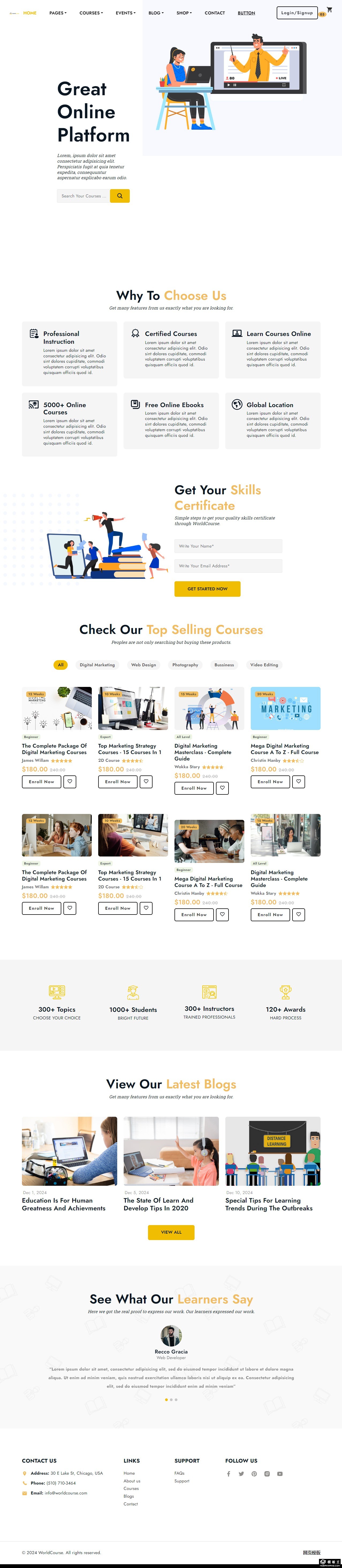该模板是专门为在线课程平台设计的,旨在帮助教育者、讲师、培训机构等在线展示和销售他们的课程、活动以及相关产品。模板的设计充分考虑了在线教育的特点和需求,旨在提供一个直观、易用且专业的平台,让用户能够轻松找到并购买所需的课程。