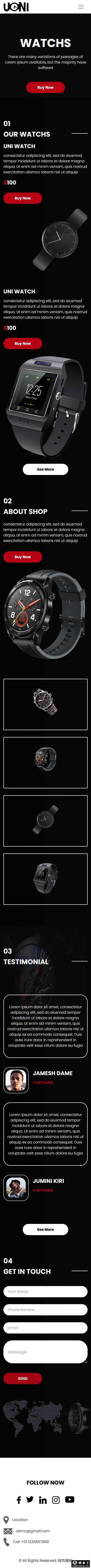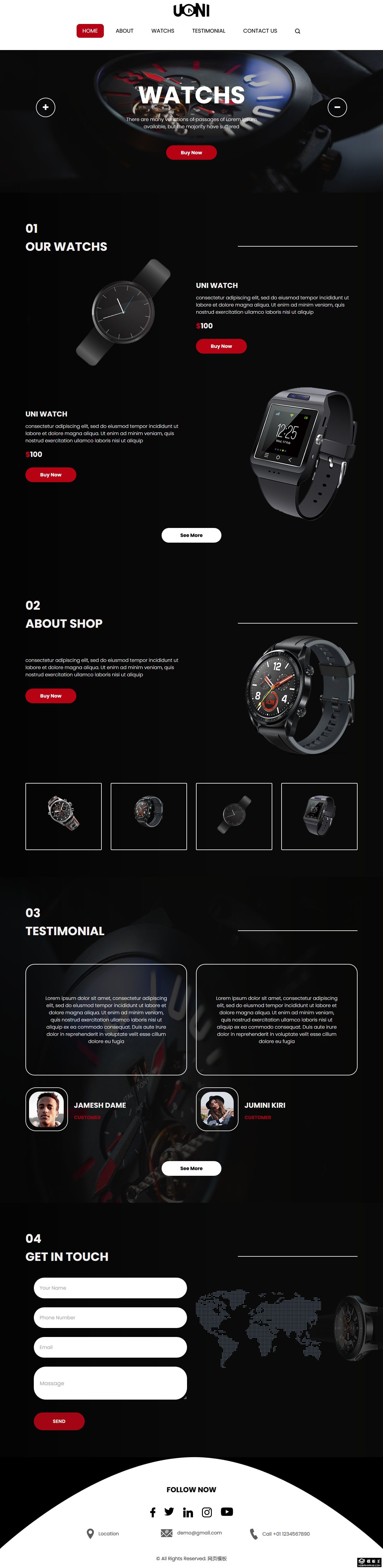 1、首页(index.html); 2、关于我们(about.html);3、手表列表展示(watchs.html);4、客户感言(testimonial.html); 5、联系我们(contact.html)。