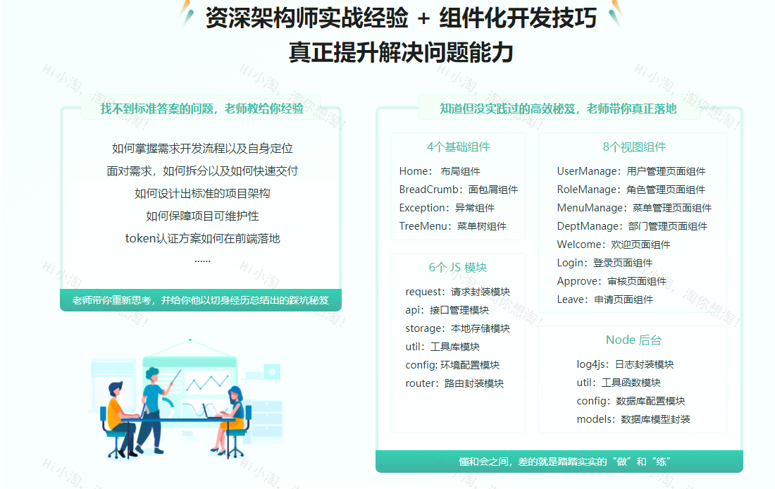 项目开发完成后,我们会重点讲解在人力短缺的工作中,如何提效,如何优化重构模块,我们会重点开发脚手架和低代码组件来实现降本增效。