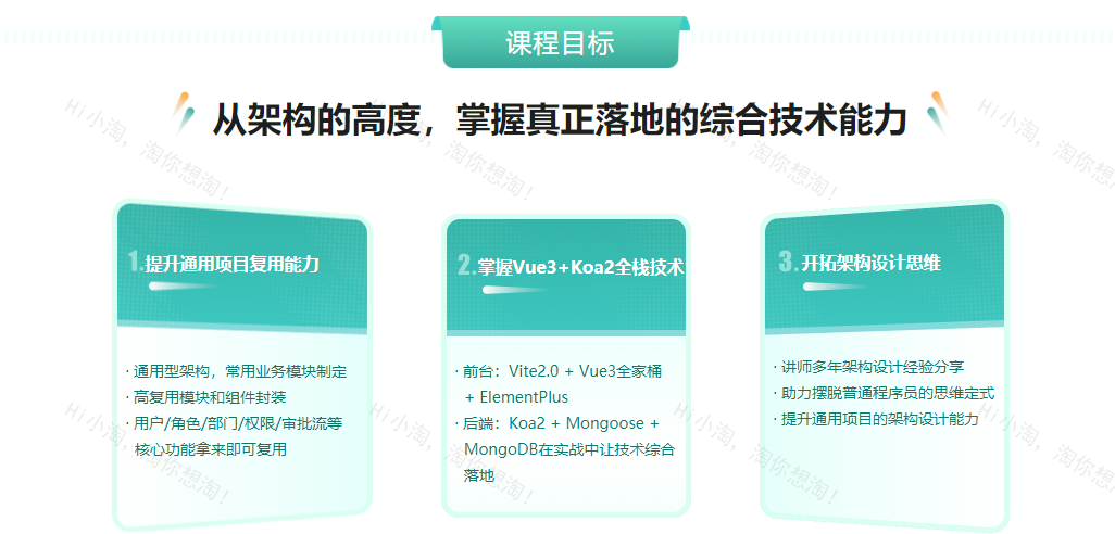 现如今前端的边界在持续扩大,企业对于工具化、平台化、全栈化能力要求也越来越高。本课程将应用Vite2.0 + Vue3 + ElementPlus+Koa2+Mongo开发一个通用后台管理系统,带大家掌握全栈开发能力,及真正落地的综合技术能力。
