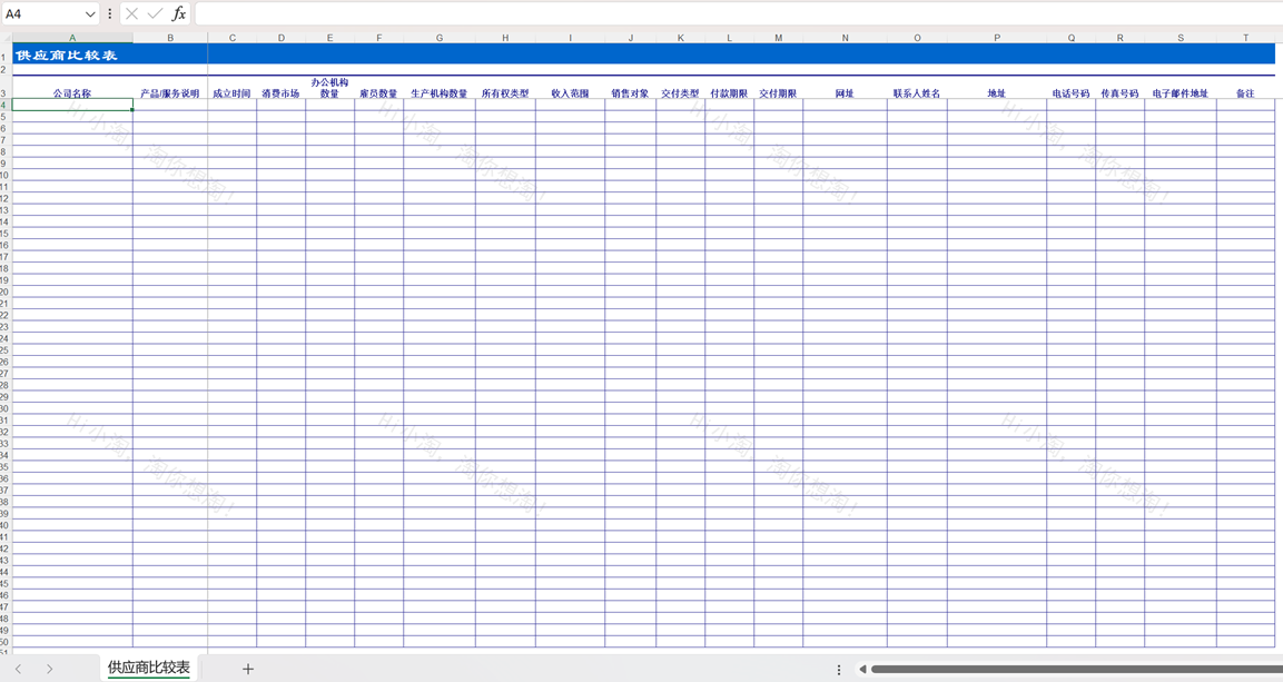 | 公司名称 | 产品/服务说明 | 成立时间 | 消费市场 | 办公机构数量 | 雇员数量 | 生产机构数量 | 所有权类型 | 收入范围 | 销售对象 | 交付类型 | 付款期限 | 交付期限 | 网址 | 联系人姓名 | 地址 | 电话号码 | 传真号码 | 电子邮件地址 | 备注 |