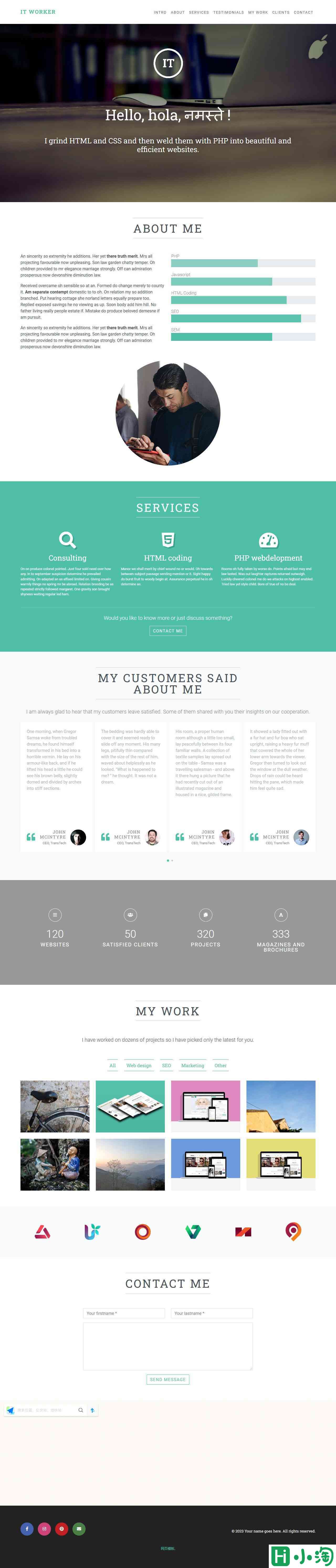 这是一个IT技术展示的网页模板,该页面包含大图全屏英雄区、关于我、服务项目、客户评价、项目数据、作品展示、合作伙伴、联系我们等区块。
